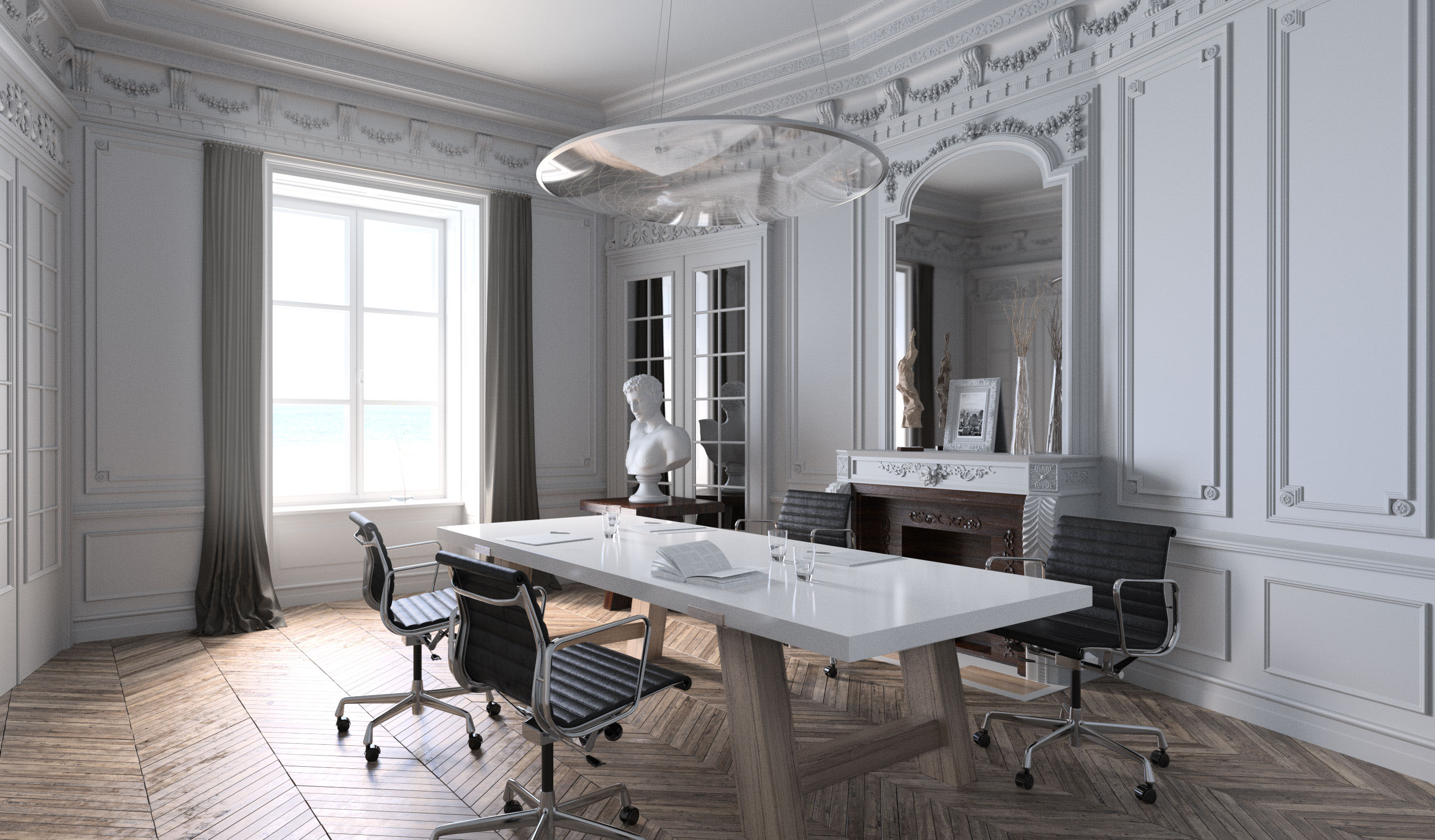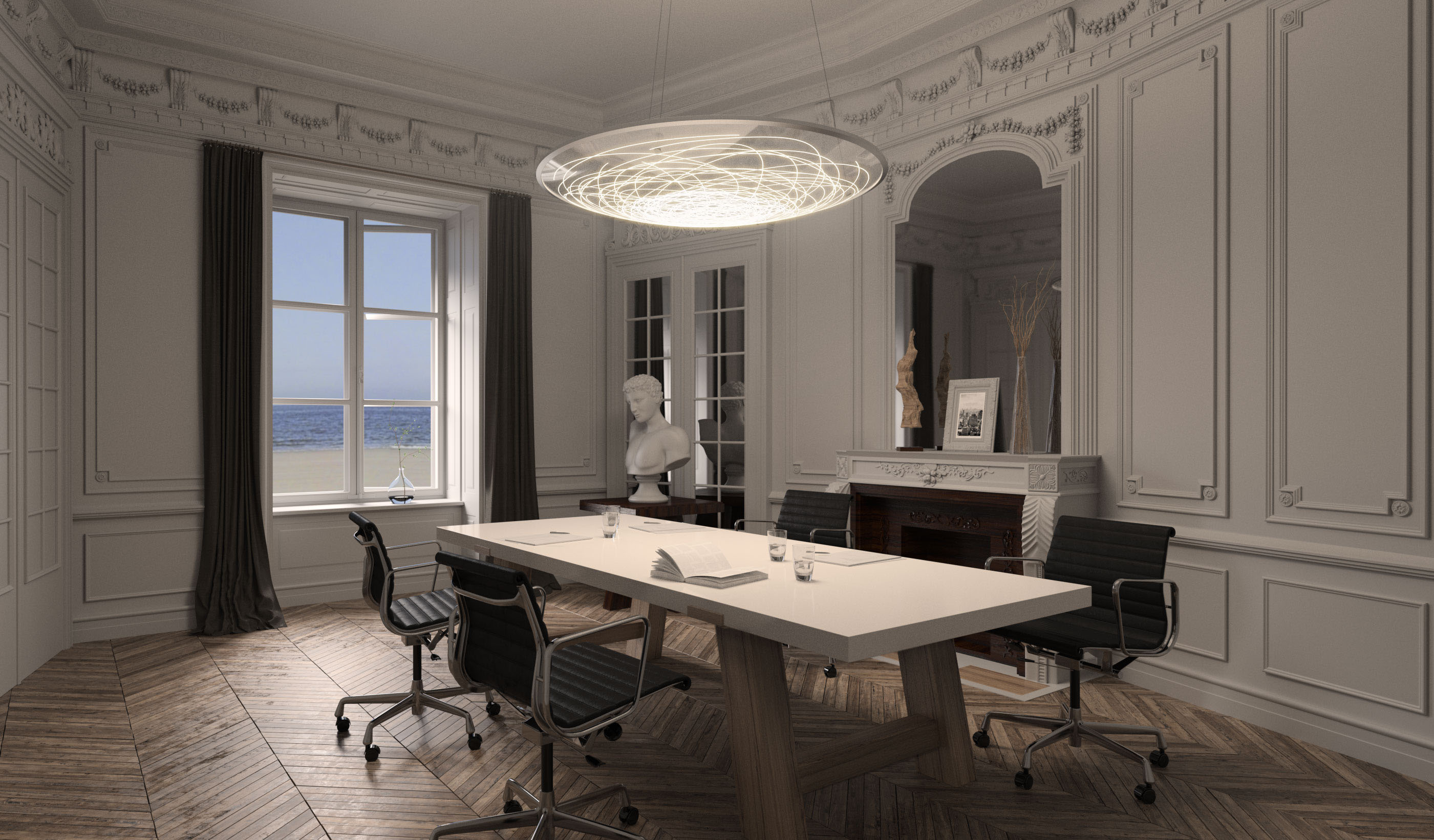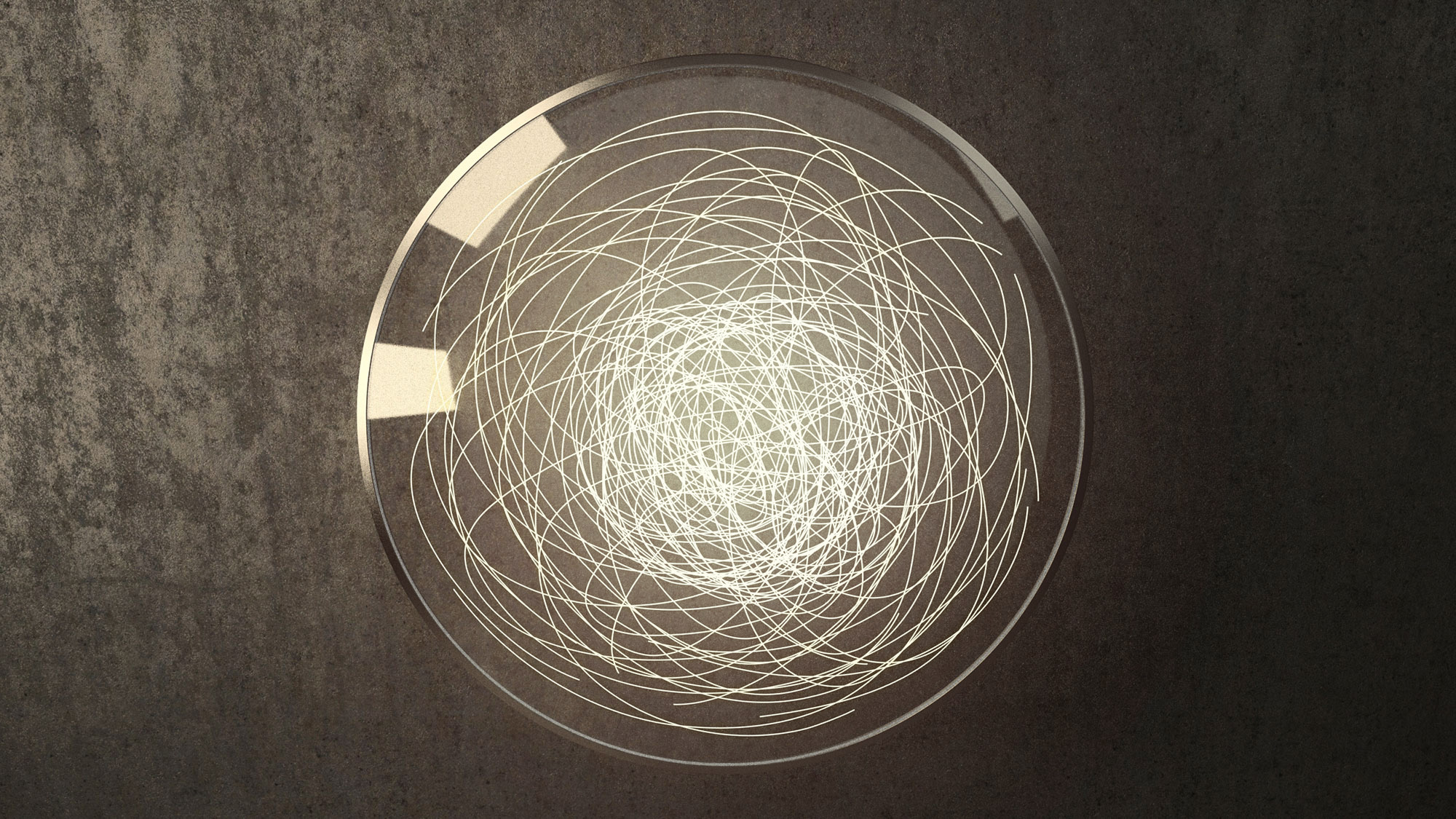 With its lightness, Cielo sublimely floats in the air. The reserved and random texture in convex acryl glass shows its surprisingly strong lighting effects only in its near spatial environment. The luminous threads create a soft and homogeneously glare-free lighting atmosphere.